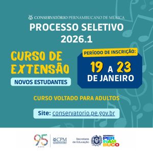 A formação é destinada ao público adulto, e os interessados podem se candidatar até o dia 23 de janeiro, por meio do site oficial da instituição. O Conservatório Pernambucano de Música (CPM) abre nesta segunda-feira (19) as inscrições para a seletiva do Curso de Extensão 2026.1. O curso representa uma oportunidade para adultos que desejam […]