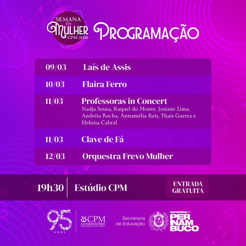 O Conservatório Pernambucano de Música (CPM) realiza, de 9 a 13 de março, a Semana da Mulher CPM 2026, com uma programação especial em celebração ao Dia Internacional da Mulher, comemorado em 8 de março. As apresentações são gratuitas e abertas ao público, sempre às 19h30, no Estúdio CPM, localizado na sede da instituição, no bairro de Santo Amaro, área central do Recife.